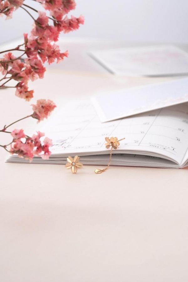 伴随着徐徐春风,清脆悦耳的风铃声不时响起,余韵悠长。Journey「遇见」系列18K玫瑰金风铃饰品以“风铃”为灵感来源,小巧的风铃采用镂空设计,配以绚烂樱花图案,清雅演绎和风风铃的细致与简洁,恬淡怡然的美感呼之欲出。徜徉在微风之中,饱含和风典韵的风铃摇曳于耳畔及颈间,宛如一首琴瑟和鸣的乐曲,举止间不时散发添加优雅的气息。