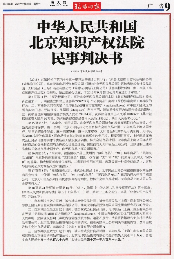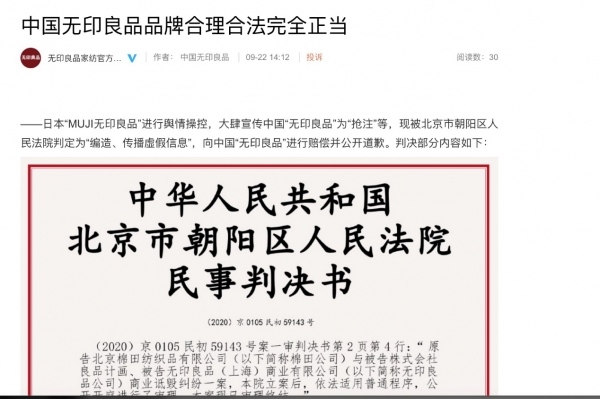 (刊登于北京无印良品官方微博的胜诉判决书)