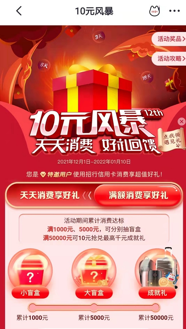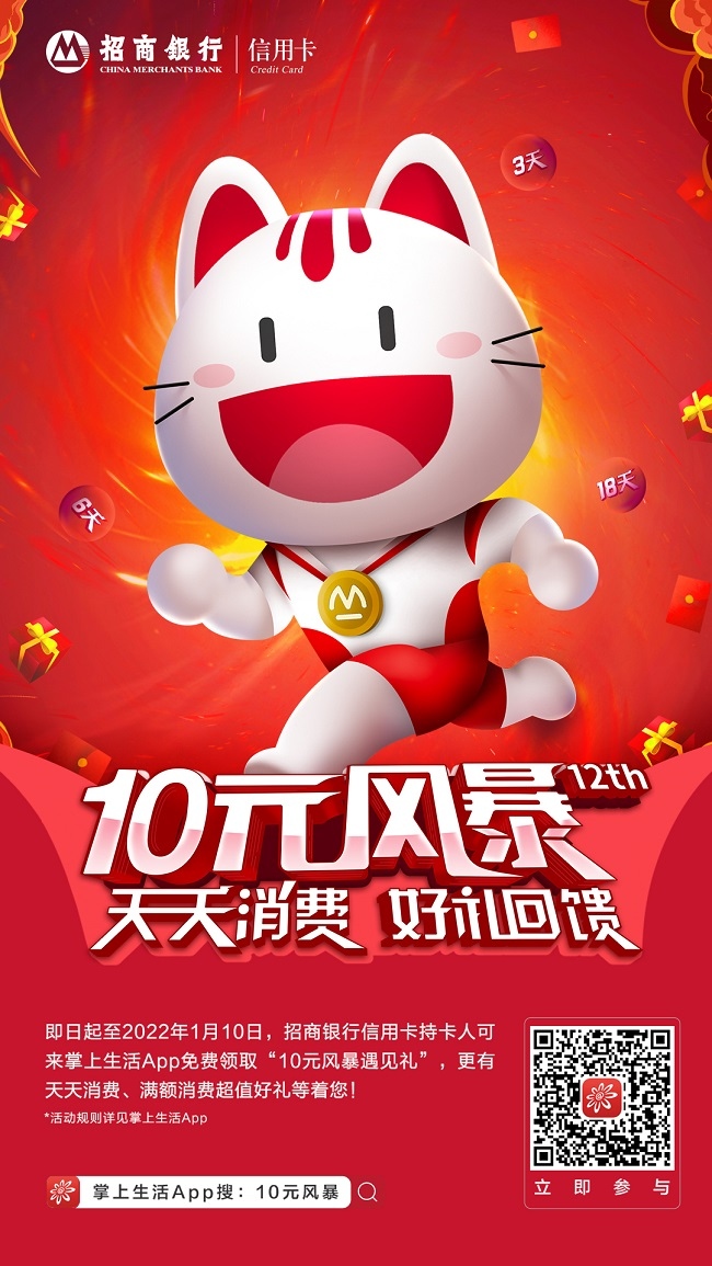 今年的“10元风暴”活动面向招行个人信用卡持卡客户,持续时间至2022年1月10日,不同于往年花式集喵、组队竞拍 PK,今年新玩法更简单,参与门槛也更低,且怎么玩都有礼。