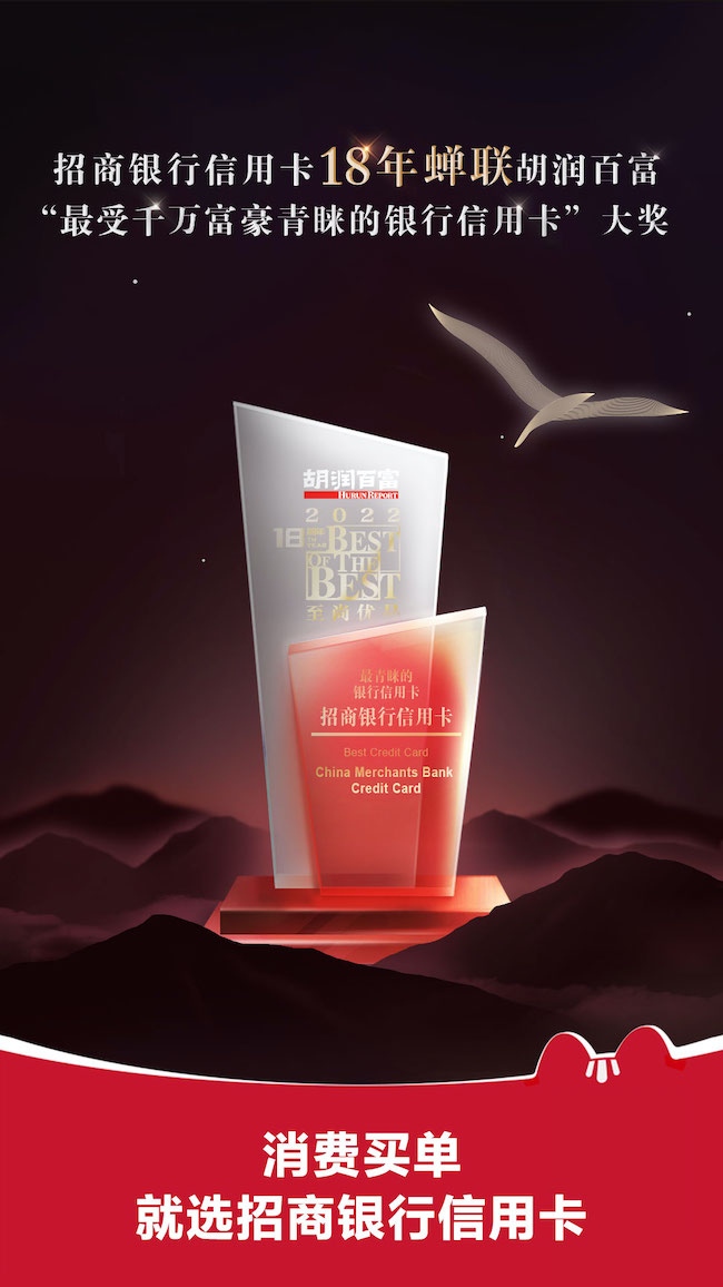 年终岁末,胡润研究院发布《2022胡润至尚优品—中国高净值人群品牌倾向报告》,“零售之王”招商银行凭借高端信用卡差异化的产品布局、疫情下坚持不缩水的权益服务、新拓展的高端生活场景礼遇,第18次蝉联胡润百富“最青睐的银行信用卡”大奖。这也是胡润研究院连续第十八年发布此报告,旨在揭示中国高净值人群生活方式、消费习惯以及品牌认知的转变与偏好。