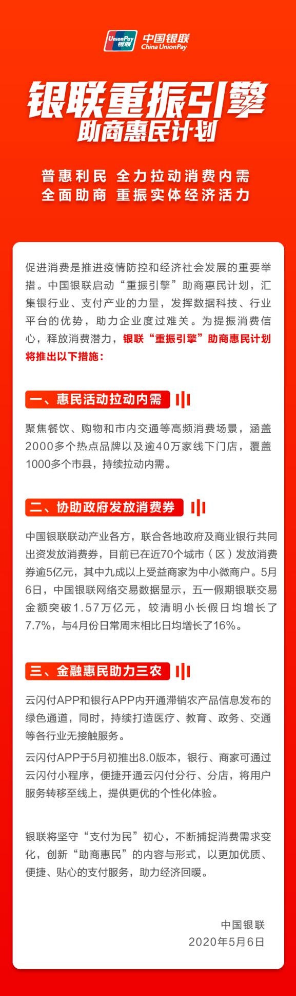 中国银联响应政府刺激经济复苏的号召,推出了“重振引擎”助商惠民计划,旨在集结支付行业力量,促进商户复工复产,刺激线下消费恢复。该计划以大型惠民活动为核心,通过补贴优惠拉动用户消费,同时配套全面的助商措施,汇聚银行业之力为商家宣传引流,帮助商家走出寒冬,重焕活力。