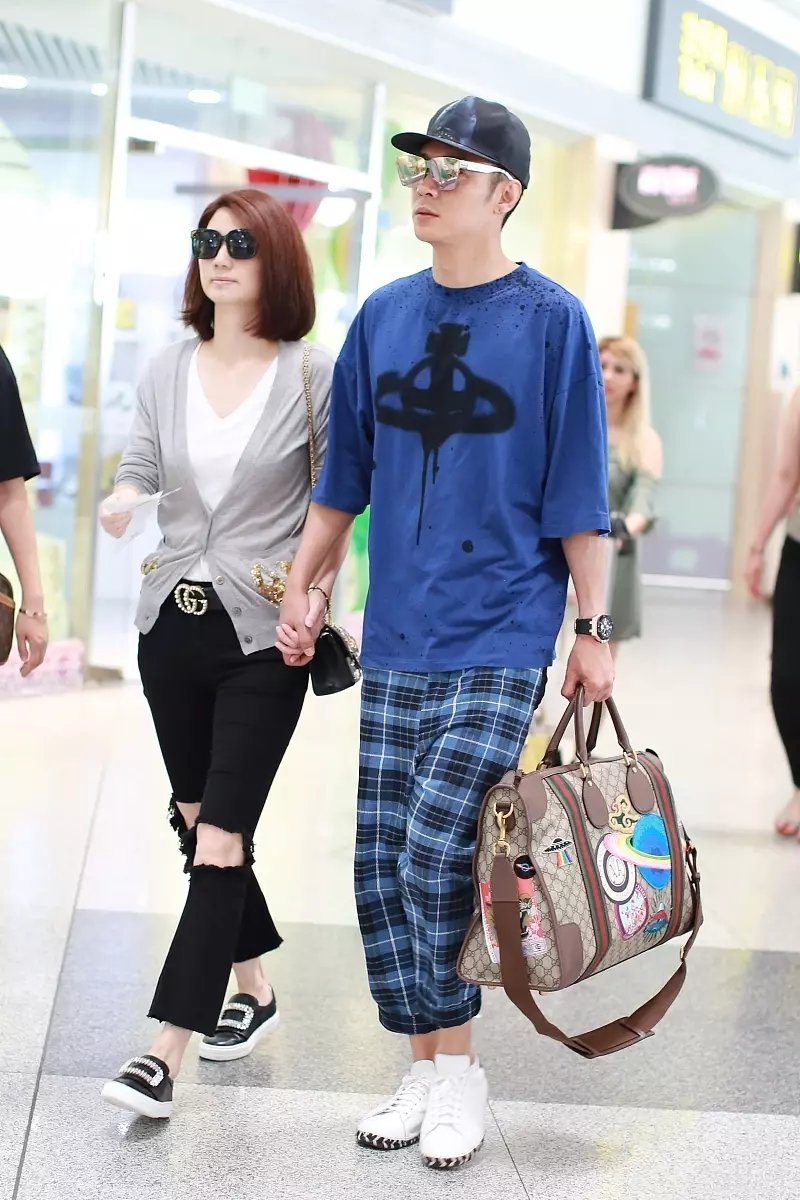 而张丹峰则身穿一件蓝色T恤调配一条蓝色格子裤,脚上踩了一双白色平底鞋,给人一种阳光英俊的视觉感,尽管他已经有39岁的年岁,可是并不是咱们印象中的“油腻大叔”的形象,再加上他这身穿搭看似很精约,可是融入了格子元素之后,却变得很经典,有种经典中透露着休闲的视觉感,特别是他手上提的这个包也过分抢镜了,这包很大,特别男性运用,给人一种很霸气又很拉风的视觉感。