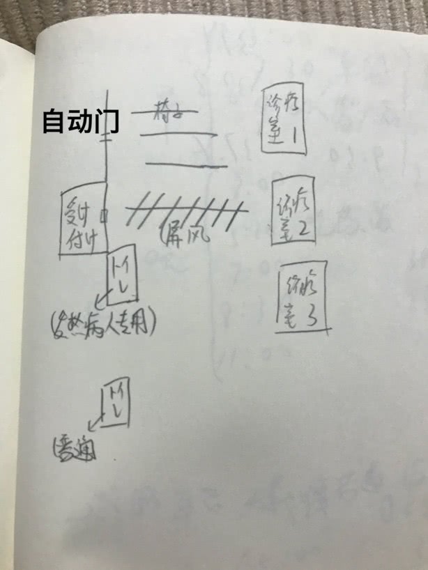 从急诊的自动门进入后,首先是一片等待区,这片区域被一块巨大的屏风与其他区域隔离开,两个接待发烧病人的诊疗室也与等待区在一个区域内。刚进入等待区,就有医生上前询问A和女友的身体状况,并询问了女友是否与A有过密切接触,经过判断后将A和女友一起留在了等待区中。另一位之后进入等待区的老年人,则因为没有发烧症状被领往屏风另一侧。