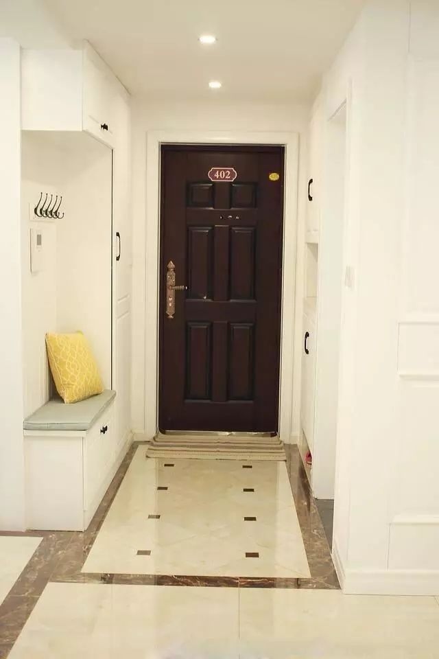 这是我家的入户玄关,左面做了衣柜,预留了挂衣服或许挂包包的当地;左面做了鞋柜;地上贴了菱形的地砖,做了波导线,很漂亮!