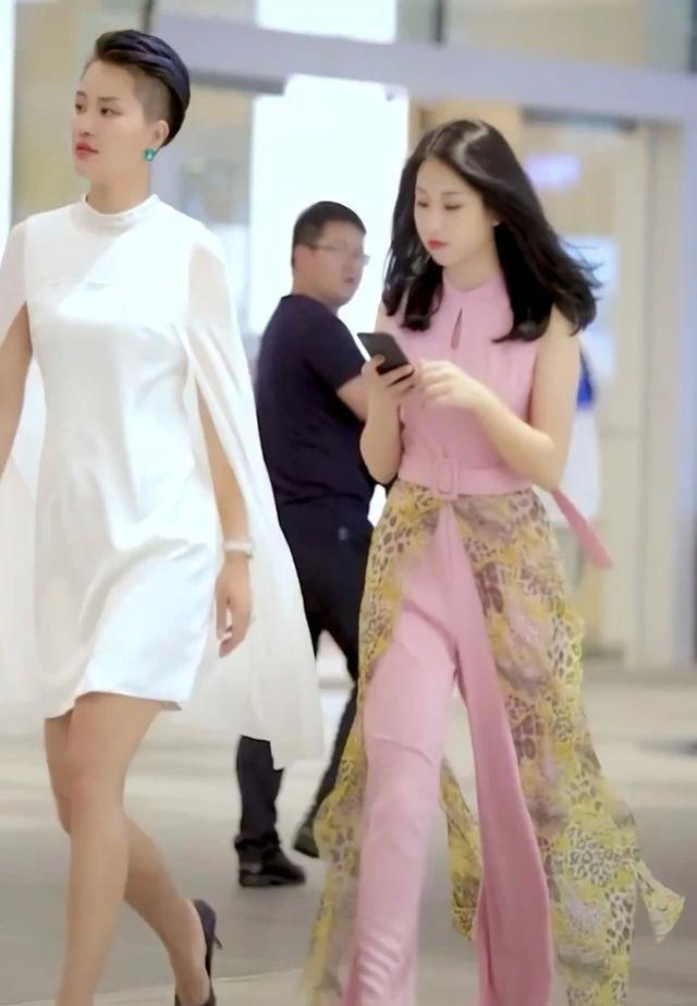 右边小姐姐的造型就不相同了,她穿的是一套粉色的裤装调配,还脚踩高跟鞋,长发披肩的小姐姐特别穿搭显身段也很英俊。这俩闺蜜出街造型都“加一件”,调配却是意外美观了!