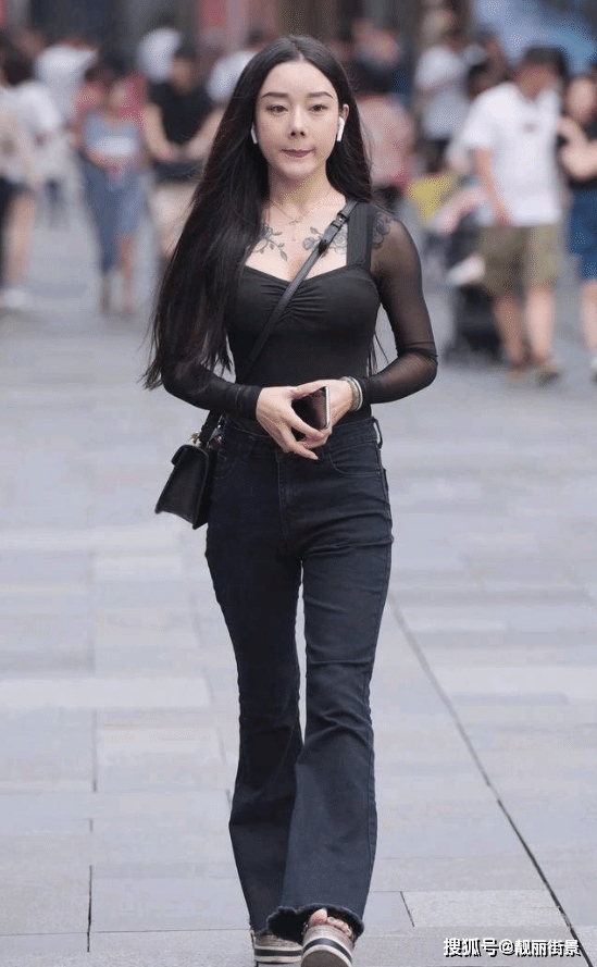 而裤子则是调配一件俭朴素雅,休闲风格十足的复古牛仔裤喇叭裤。牛仔裤喇叭裤尽管不是紧身,贴身作用极好的那种。可是,仍然能把腿部润饰得很细长纤瘦,展现出腿部的线条美感。比较紧身裤,这种裤子看上去愈加高雅大气,会多一些女神高冷的健康气质。