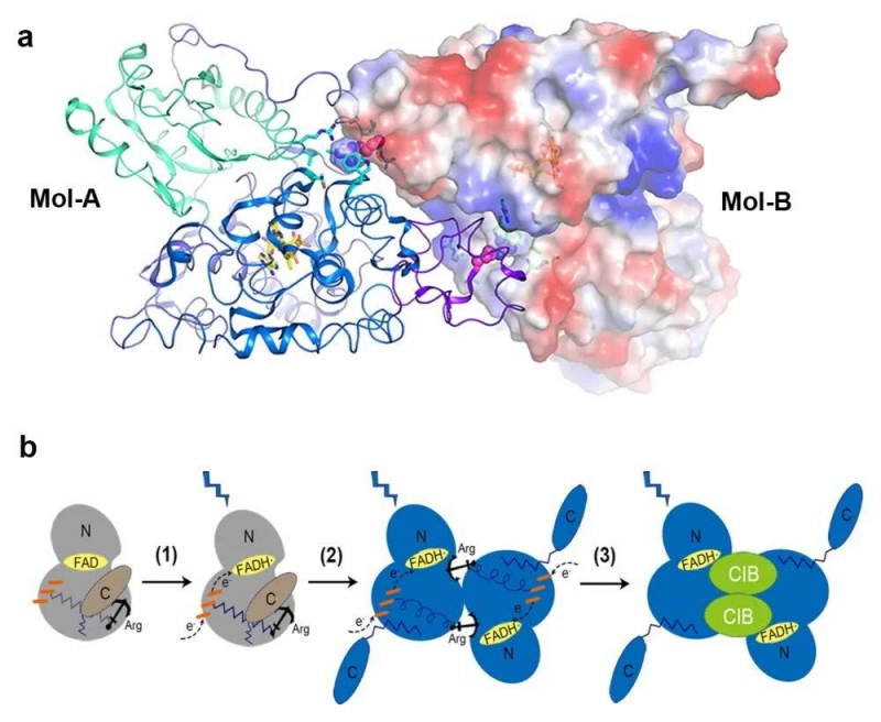 植物蓝光受体CRY-PHR激活状况二聚体三维结构(a)及光信号传递的分子进程(b)