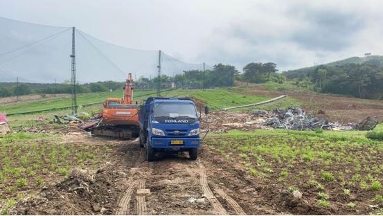 进到景区内装废钢,进入景区时把我的路压坏。把员工新创家园的种苗再次碾压死。