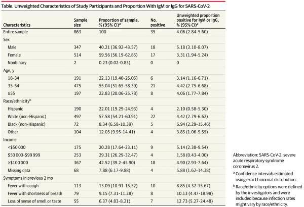 863名被测者中35名个别(4.06%;准确二项式CI,2.84%-5.60%)抗体测验阳性。阳性份额因种族/民族、性 别和收入而异。测验成果为阳性的参与者的加权份额为4.31%。调整测验灵敏度和特异性后,SARS-CoV-2抗体的未加权和加权患病率分别为4.34%(Bootstrap CI,2.76%-6.07%)和4.65%(Bootstrap CI,2.52%-7.07%)。