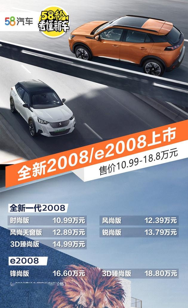 全新一代2008共5款汽油版车型,价格为10.99-14.99万元,e2008共有两款车型,补助后指导价为16.6-18.8万元。