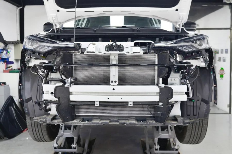 咱们又一次看到了这根圆管横梁,之前在拆CS335 plus时也见过。咱们估测或许是因为进气格栅面积较大,所以需求有一根梁进行支撑,不至于被容易按瘪。