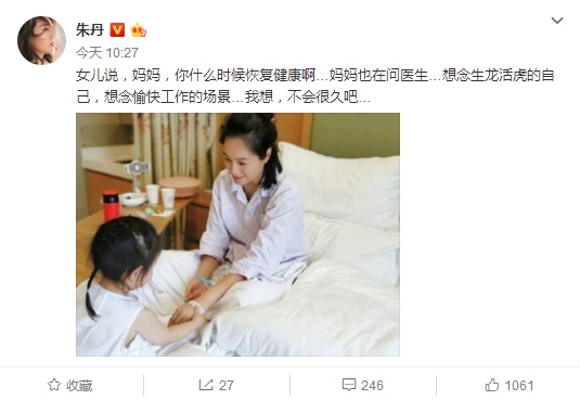 5月20日,朱丹在交际平台上共享了一张女儿来医院探望自己的相片,并配文:“女儿说,妈妈,你何时恢复健康啊…妈妈也在问医师…牵挂生龙活虎的自己,牵挂愉快作业的场景…我想,不会好久吧… ”相片中朱丹脸色苍白显得非常瘦弱,她女儿坐在床上握着她的手,画面非常暖心。